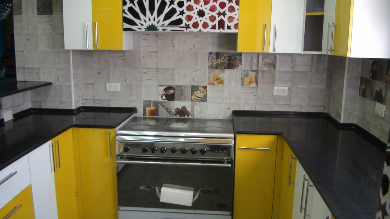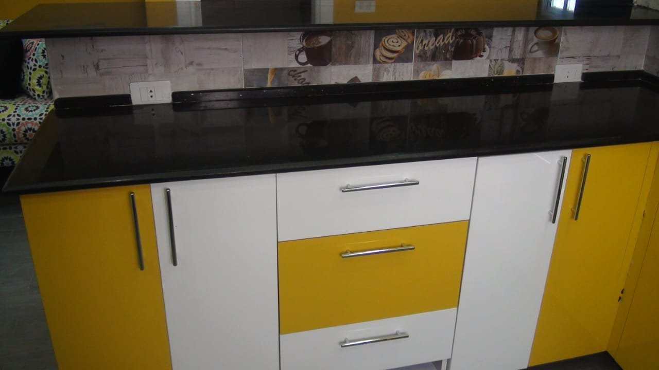 Full body, wood counter, Formica closure, treated against water, moisture, bacteria and insects + HPL/PVC/acrylic glossy doors, anti-fingerprint and scratch resistant