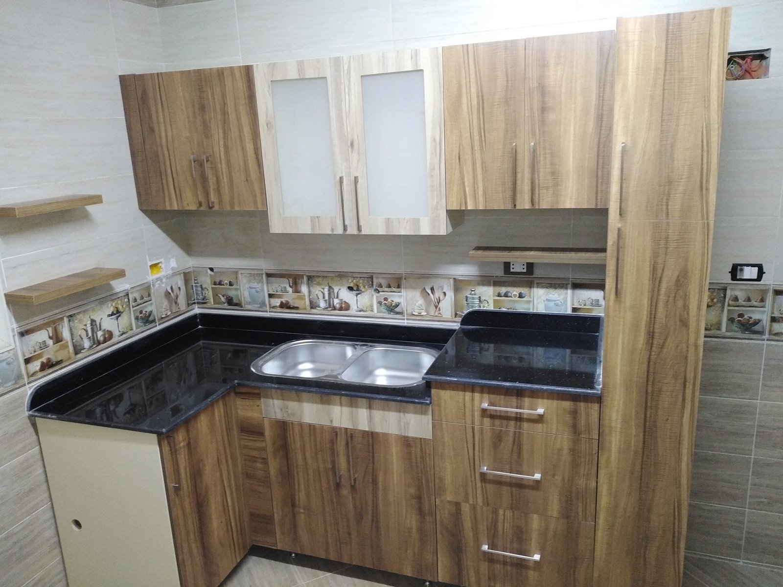 Full body, wood counter, Formica closure, treated against water, moisture, bacteria and insects + HPL/PVC/acrylic glossy doors, anti-fingerprint and scratch resistant