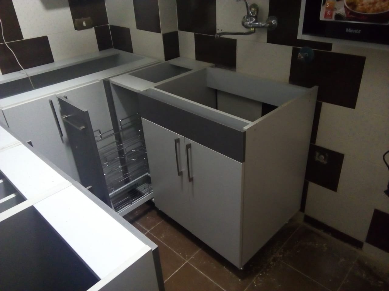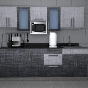 Full body, wood counter, Formica closure, treated against water, moisture, bacteria and insects + HPL/PVC/acrylic glossy doors, anti-fingerprint and scratch resistant